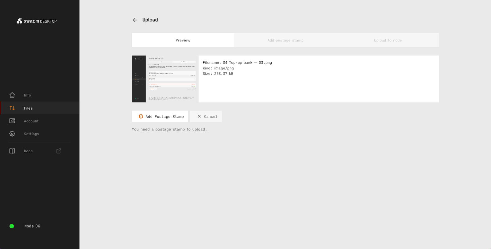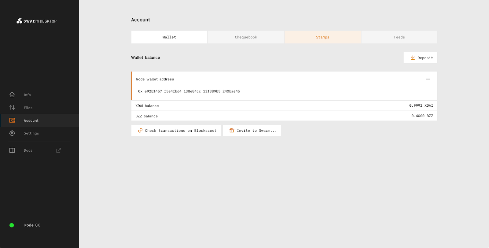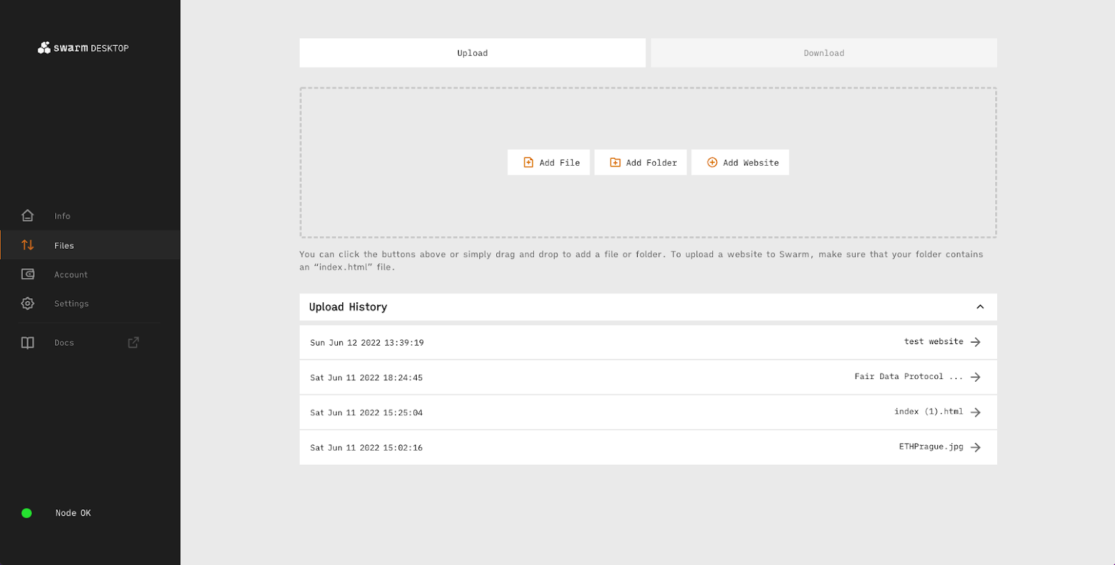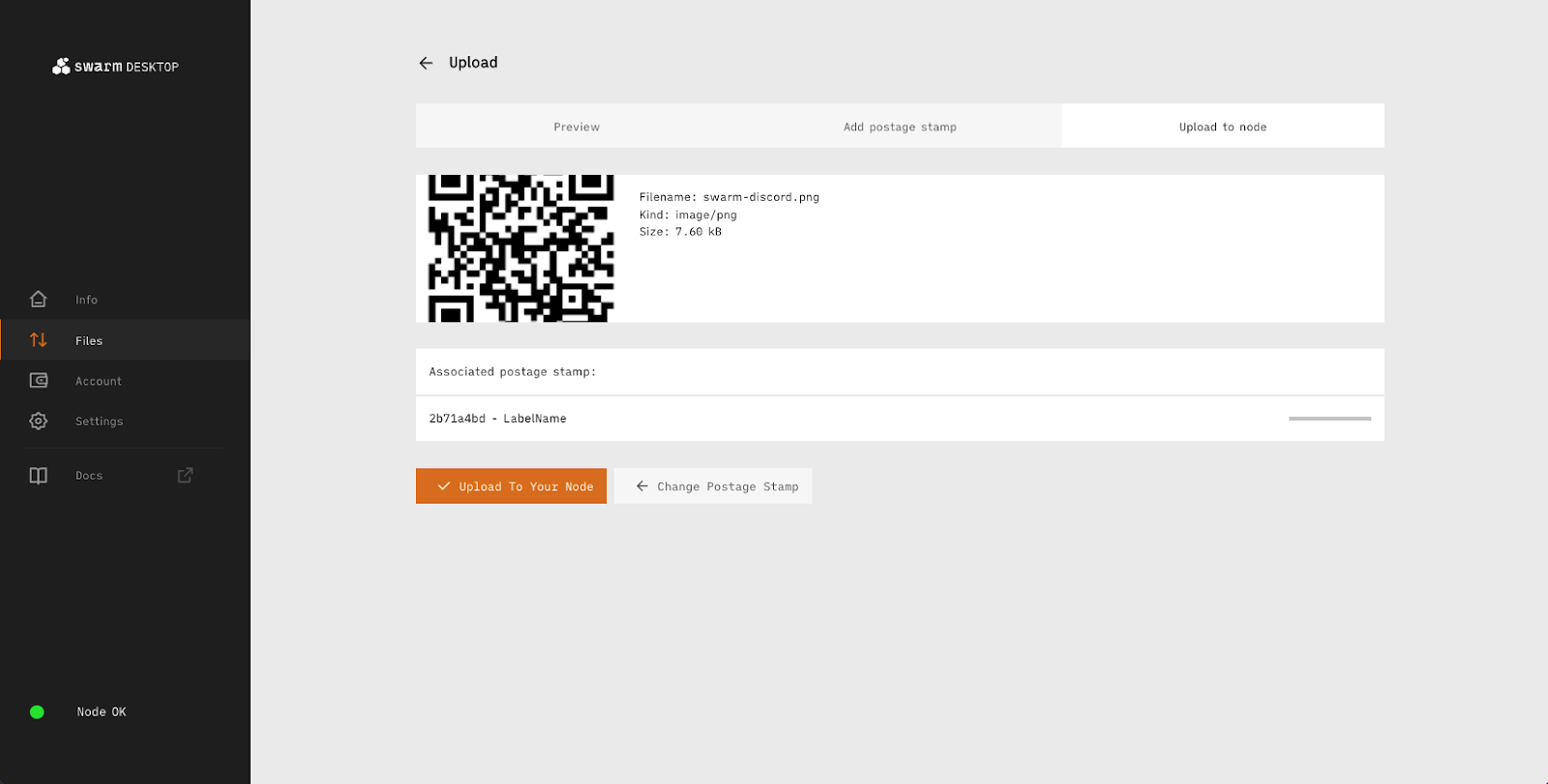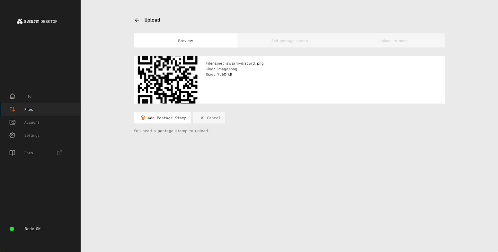 Running the Swarm Desktop App (Beta) in light mode lets you upload files, folders or websites to the Swarm network. To do that you first need to buy postage stamps.