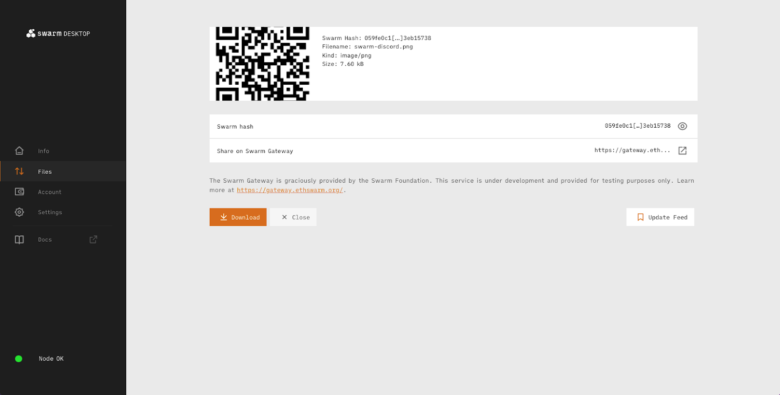 Once your file is uploaded a Swarm hash and Swarm Gateway link will be displayed (which you can use to share the file with others) along with other pertinent information.