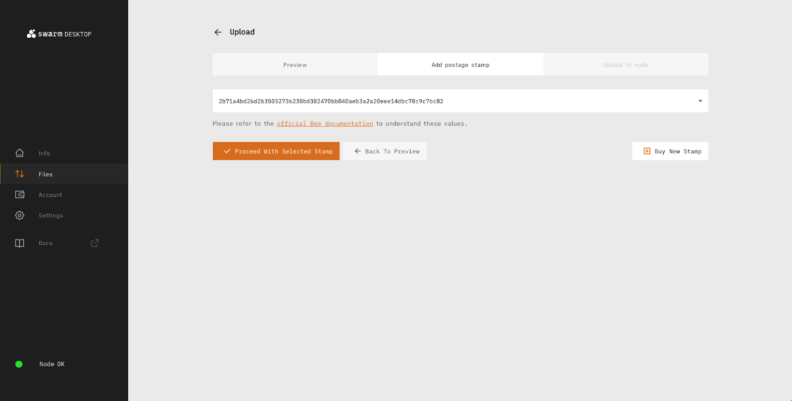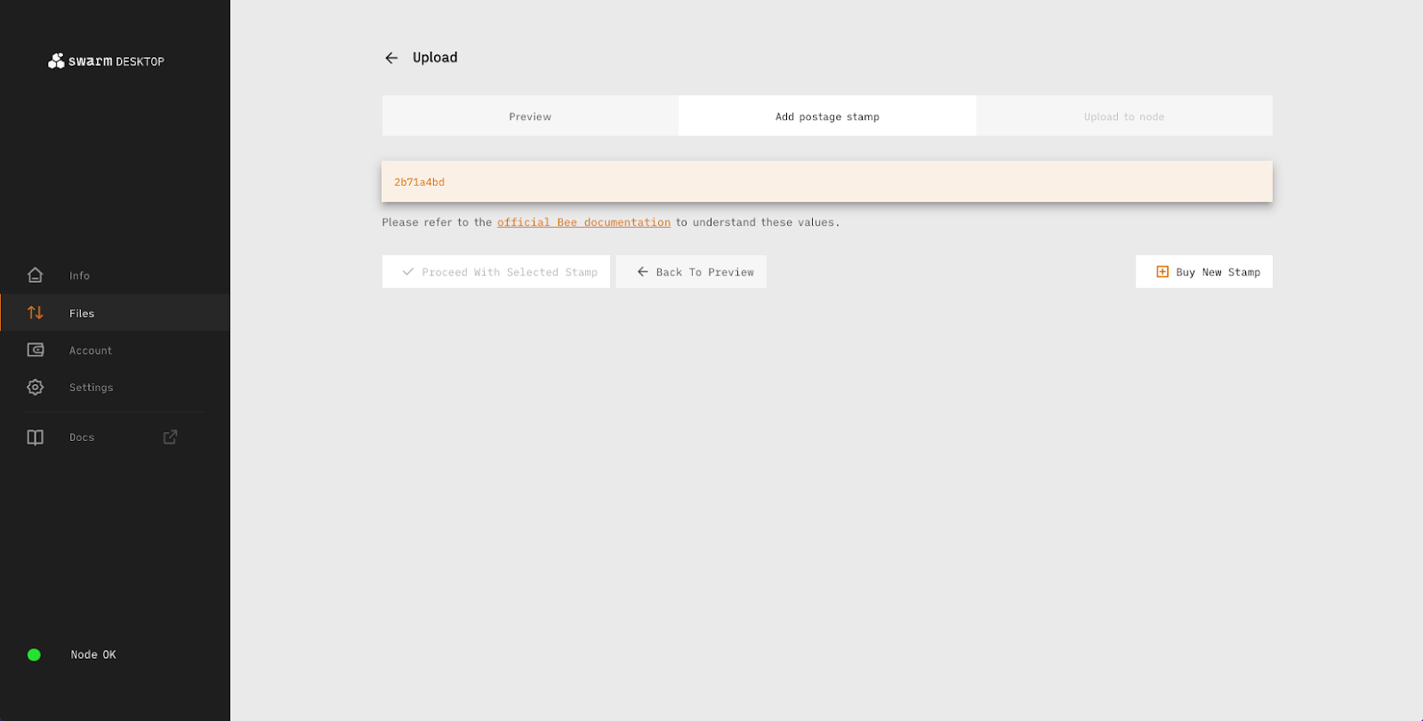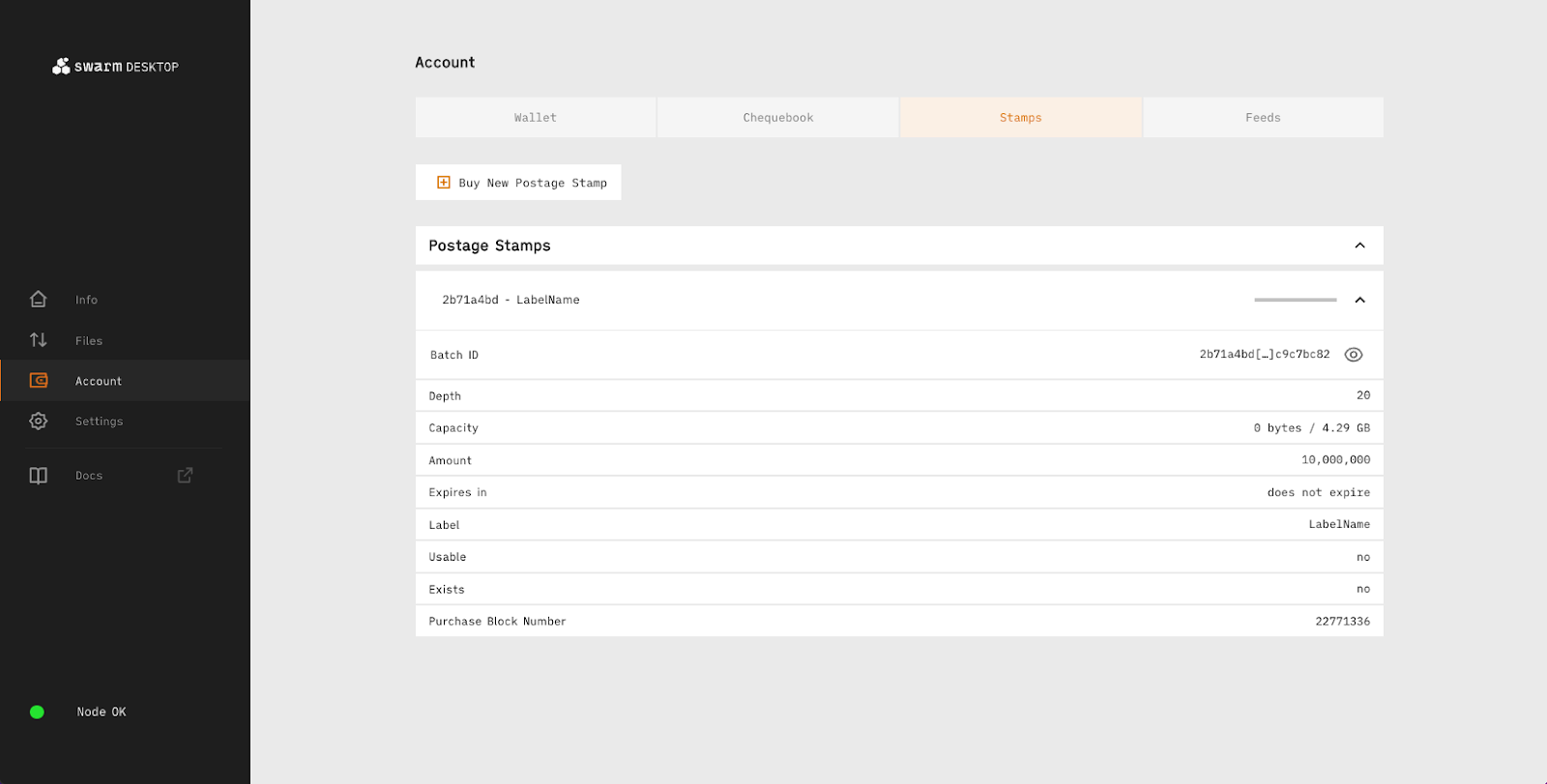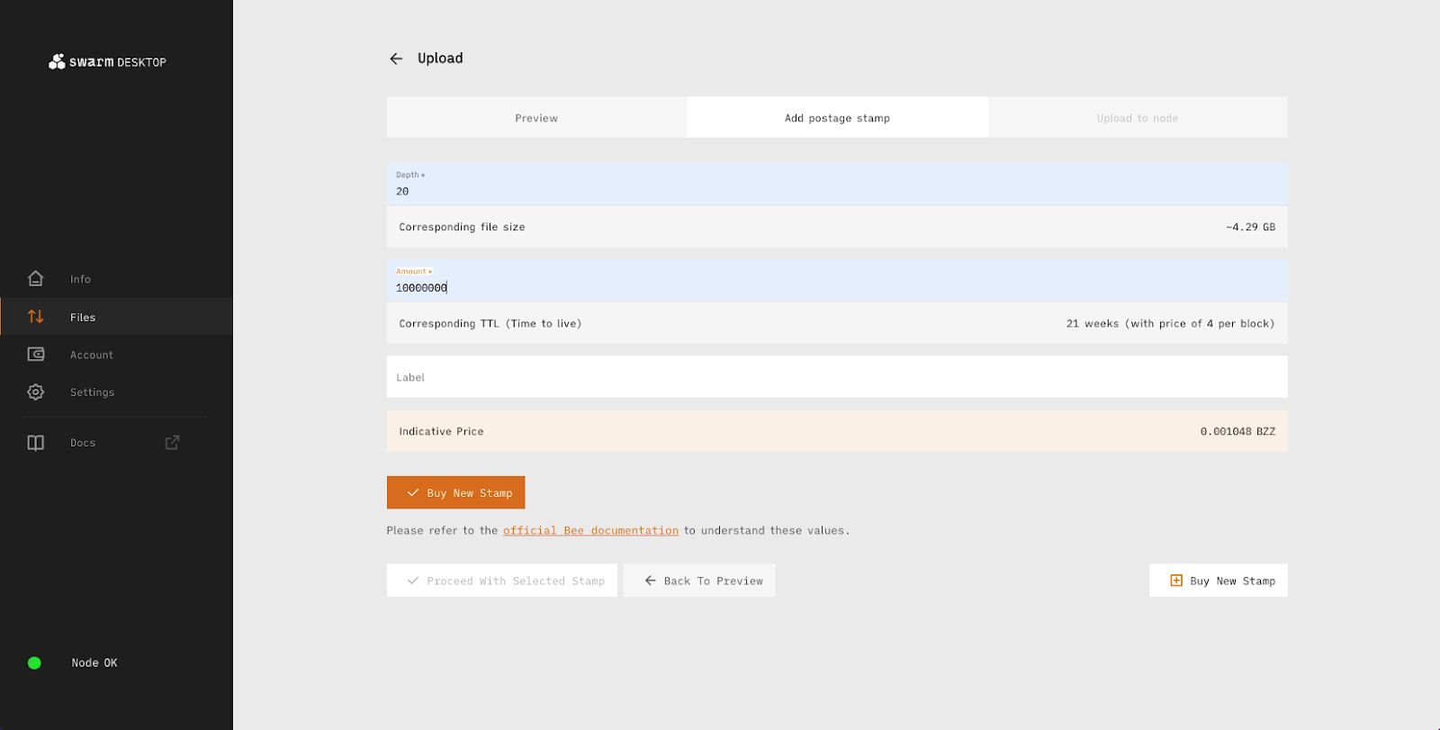 “Depth” corresponds to the amount of bytes you wish to upload, while the “Amount” parameter relates to the amount of time your data will be stored on the network. When you have made your selection, click “Buy new stamp”