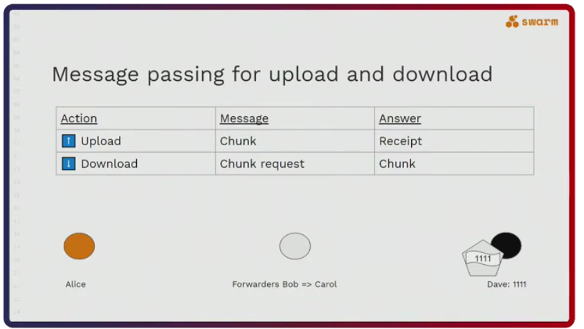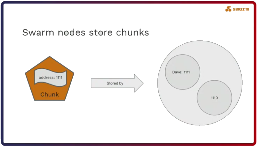 But Swarm nodes don’t just forward messages. This is reserved for uploading and downloading data. They also store chunks, which contain data and have an address. As Rinke pointed out in his talk, chunk addresses are very important because they determine which nodes will store them. Nodes will store chunks with similar addresses. Also, the same chunk will be stored by multiple nodes to provide redundancy in case nodes come and go from the network.