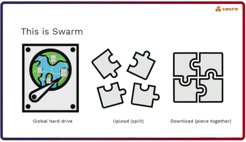 Rinke sees Swarm as a global hard drive hosted by computers across the globe, which collaborate because they are incentivised to do so. Just like a normal computer, files and websites can be uploaded and downloaded to and from Swarm.