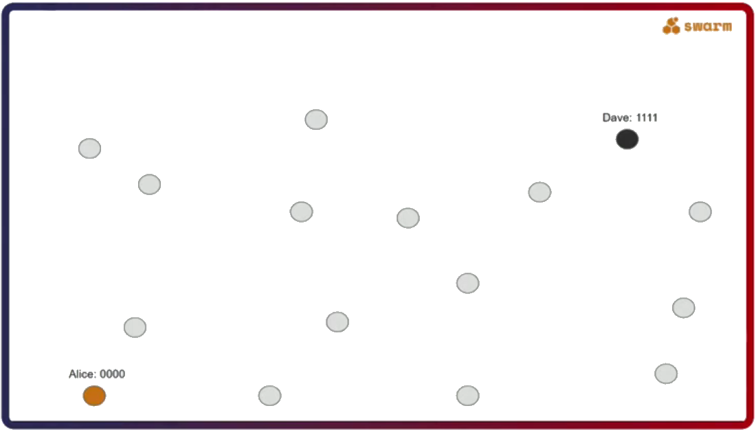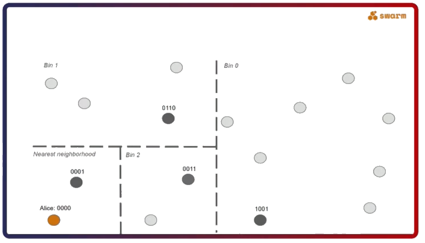 The second important thing about Swarm is that its network uses a specific type of a distributed hash table called Forwarding Kademlia. Let’s say Alice (address 0000) wants to send a message to Dave (address 1111). The question here is, what kind of a connectivity pattern does Alice have to follow to always be able to send a message to Dave?