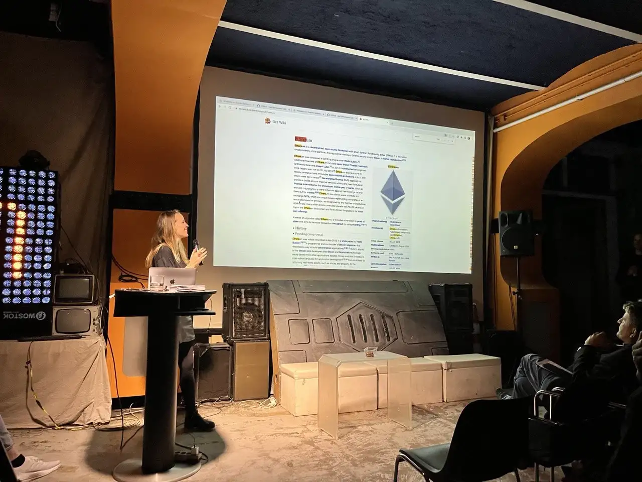 Next under the spotlight was Daniel A. Nagy. Coincidentally or not, his signature Swarm-orange shirt played right into the c-base’s theme of orange arches that made the venue feel tailor-made for Swarm and its fans.
