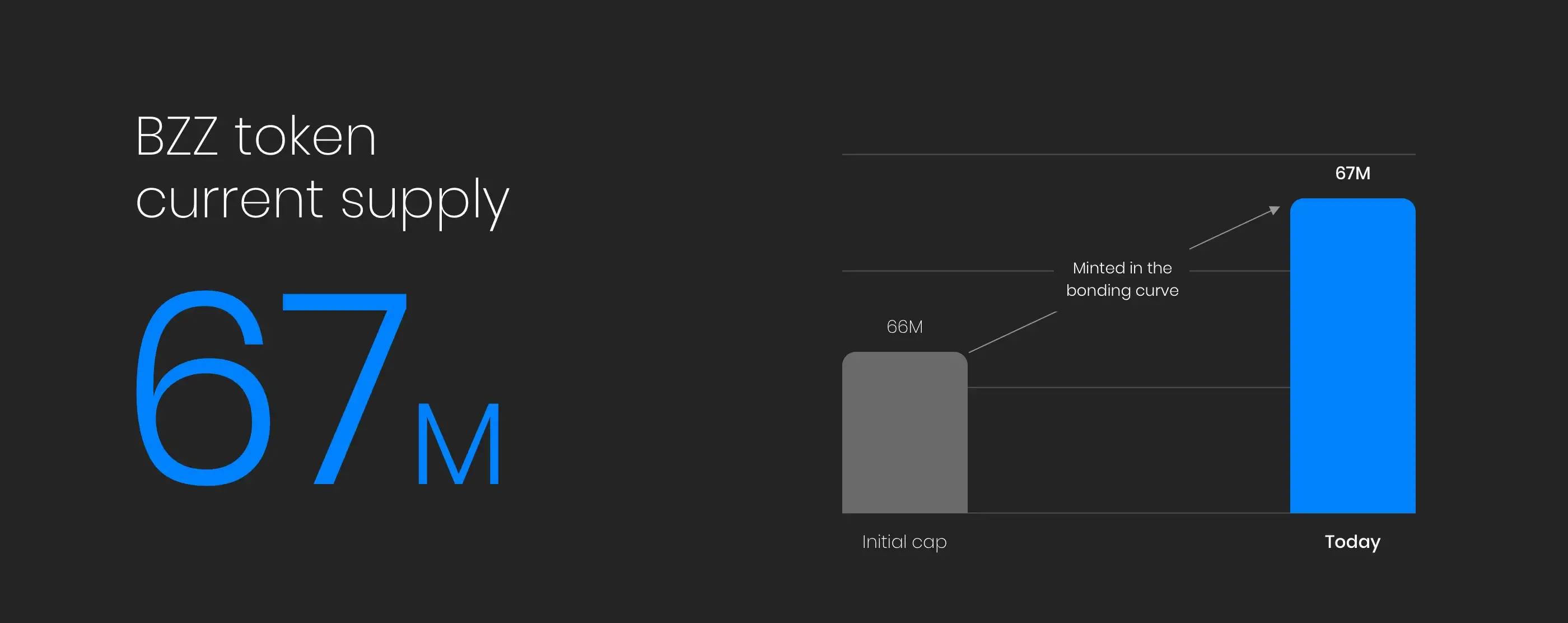 The current supply stands at a little over 67.3 million BZZ (you can check the exact circulating supply here and the price here). Around 66.2 million tokens were minted and distributed during the token launch. The rest was minted afterwards through the bonding curve.