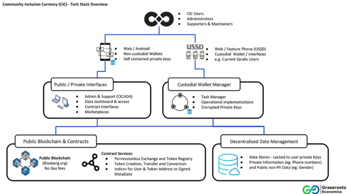 Grassroots Economics will soon be deploying a new custodial key management system that allows communities to create their own CIC via smart contracts on an EVM blockchain. By creating their own CIC, they are creating a credit against their future production that will be circulated internally and externally in the community. The CIC smart contract stores the information about the token issuer and determines the expiration rate, while their USSD interface enables users to access their blockchain wallet and transfer tokens. By using liquidity pools, these CICs can be connected to each other. For a deeper understanding of how this can work, please read this article. Besides CICs being redeemable for goods and services, they can also be used to support or buy data products or verified claims such as carbon offsets or Sustainable Development Impacts from the community creating them.