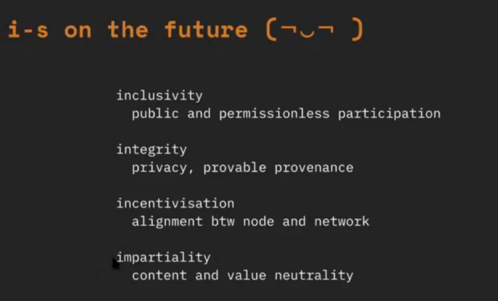 He then briefly contextualised Swarm as part of Etherum’s world computer and “holy trinity”. It extends the blockchain as the world’s data storage and communication layer, or as he put it, “the OS of the Web and its kernel”.